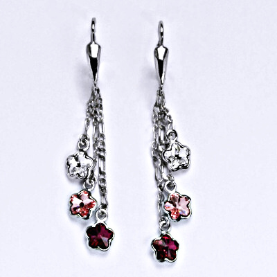Stříbrné náušnice se třemi Swarovski kytičkami zavěšenými na řetízku. Velikost krystalu je 6 mm. Barva krystalů je fuchsia, rose a čirá. Nášnice mají klasické zapínání na patent.