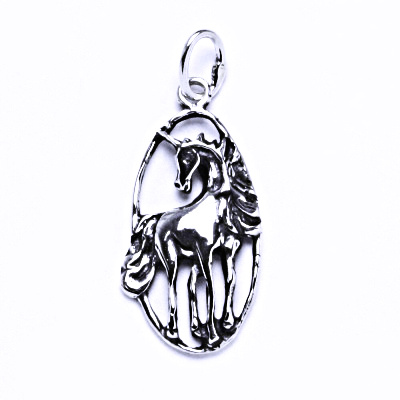 Stříbrný přívěšek s patinou kůň celý v podkově s patinou. Rozměr přívěsku je 26 mm včetně očka na výšku a 10 mm na šířku. Materiál je stříbro 925/1000. Orientační váha přívěsku je 0,90 g.