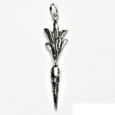 Stříbrný přívěsek - mrkev s patinou. Materiál je stříbro 925/1000. Rozměr přívěsku je 42 mm včetně očka na výšku a 10 mm na šířku. Orientační váha přívěsku je 1,45 g.
