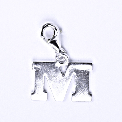 Stříbrný přívěšek ve tvaru písmenka "M" na karabince. Výška písmenka i s karabinou 20 mm. Materiál je stříbro 925/1000.