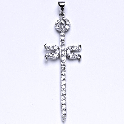 Stříbrný přívěšek se syntetickými zirkony. Celková výška přívěsku je 57 mm. Šířka přívěsku je 28 mm.