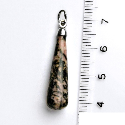 Stříbrný přívěsek je zdoben přírodním rhodonitem. Materiál je stříbro 925/1000. Orientační váha přívěsku je 3,31 g. Rozměr přívěsku je 38 mm včetně očka na výšku a 7 mm na šířku.