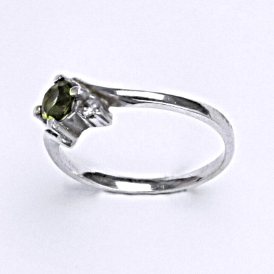 Stříbrný prsten s přírodním vltavínem a s čirými zirkony. Velikost kamene je 5 mm. Materiál je stříbro 925/1000. Prsten má povrtchovou úpravu čisté rhodium.