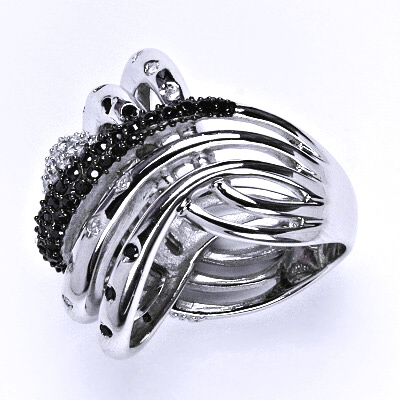 Stříbrný prsten s čírými a černými zirkony. Orientační váha prstenu je 15,10 g.