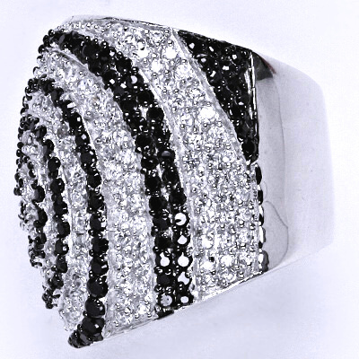 Stříbrný prsten s čírými a černými zirkony. Orientační váha prstenu je 16,44 g.