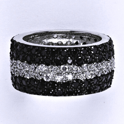 Stříbrný prsten s čirými a černými zirkony. Orientační váha prstenu je 13,97 g.