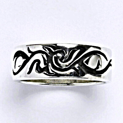 Stříbrný prsten s patinou. Prsten nabízíme ve velikosti 62. Orientační váha prstenu je 7,43 g. Šířka šíny prstenu je 8 mm. Materiál je stříbro 925/1000.