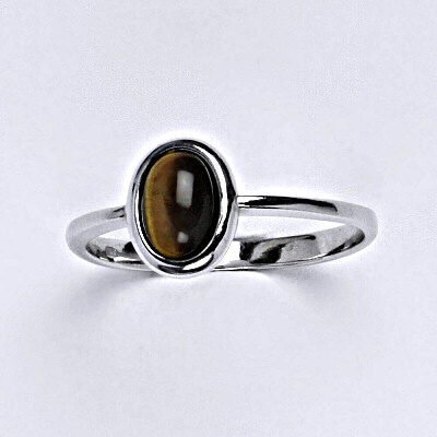 Stříbrný prasten s přírodním kamenem tygří oko. Velikost kamene je 7 x 5 mm. Materiál je stříbro 925/1000. Prsten má povrchovou úpravu čisté rhodium.