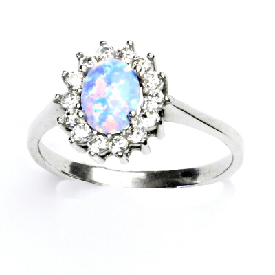 Stříbrný prstýnek je zdoben malými čirými zirkony a syntetickým světle modrým opálem o rozměru 8x6 mm. Materiál je stříbro 925/1000. Orientační váha prstenu ve velikosti 55 je 2,44 g.